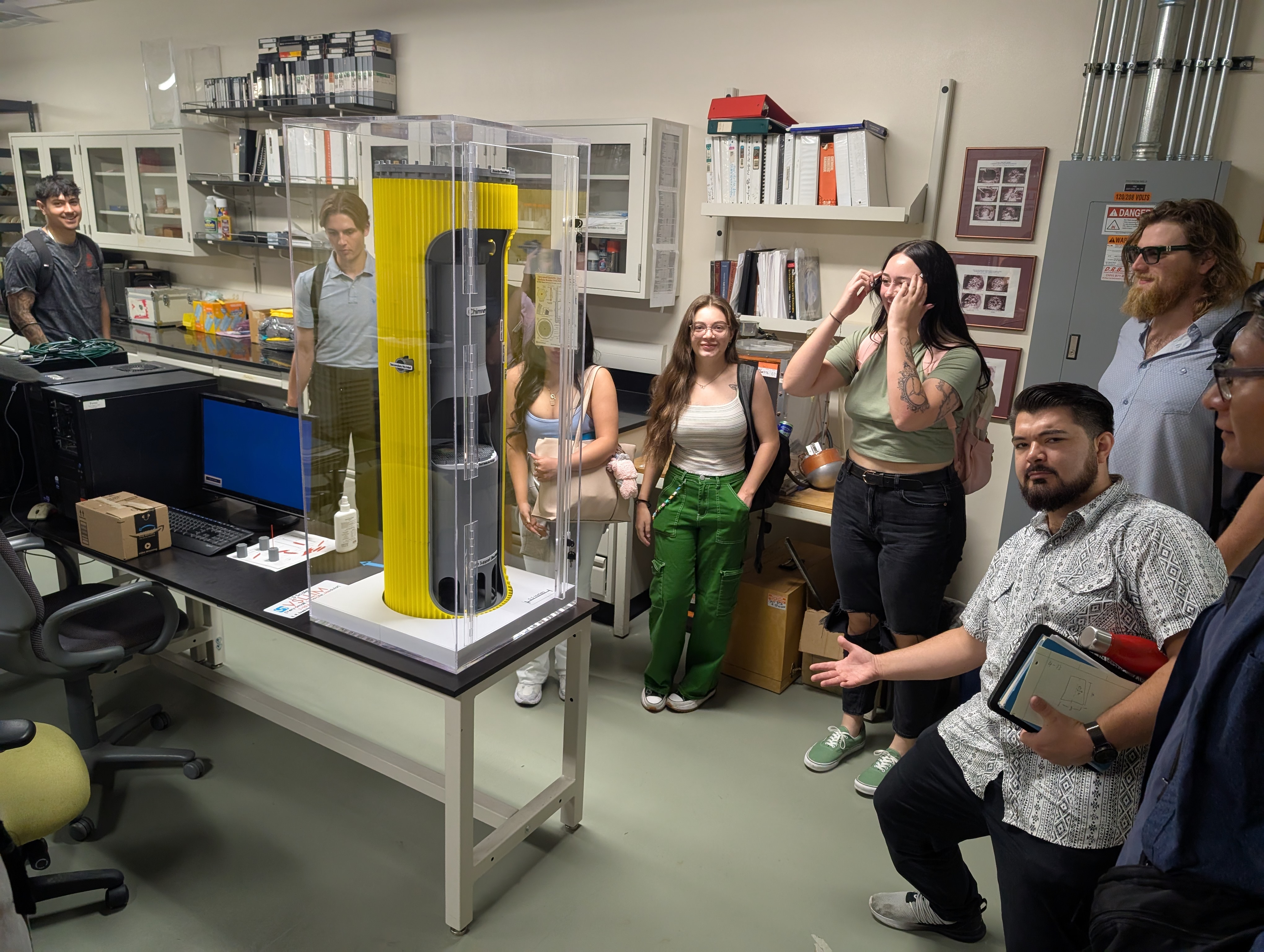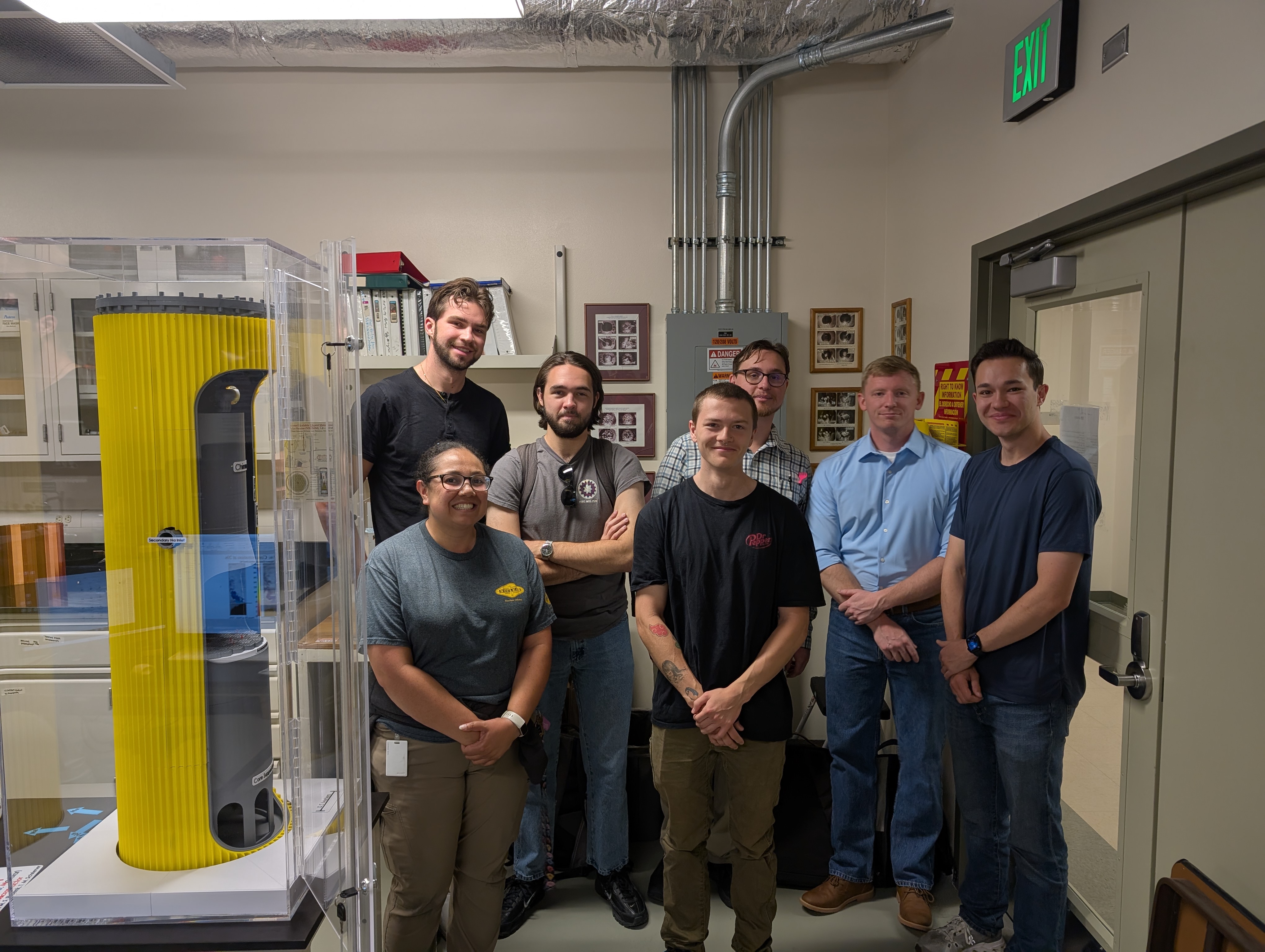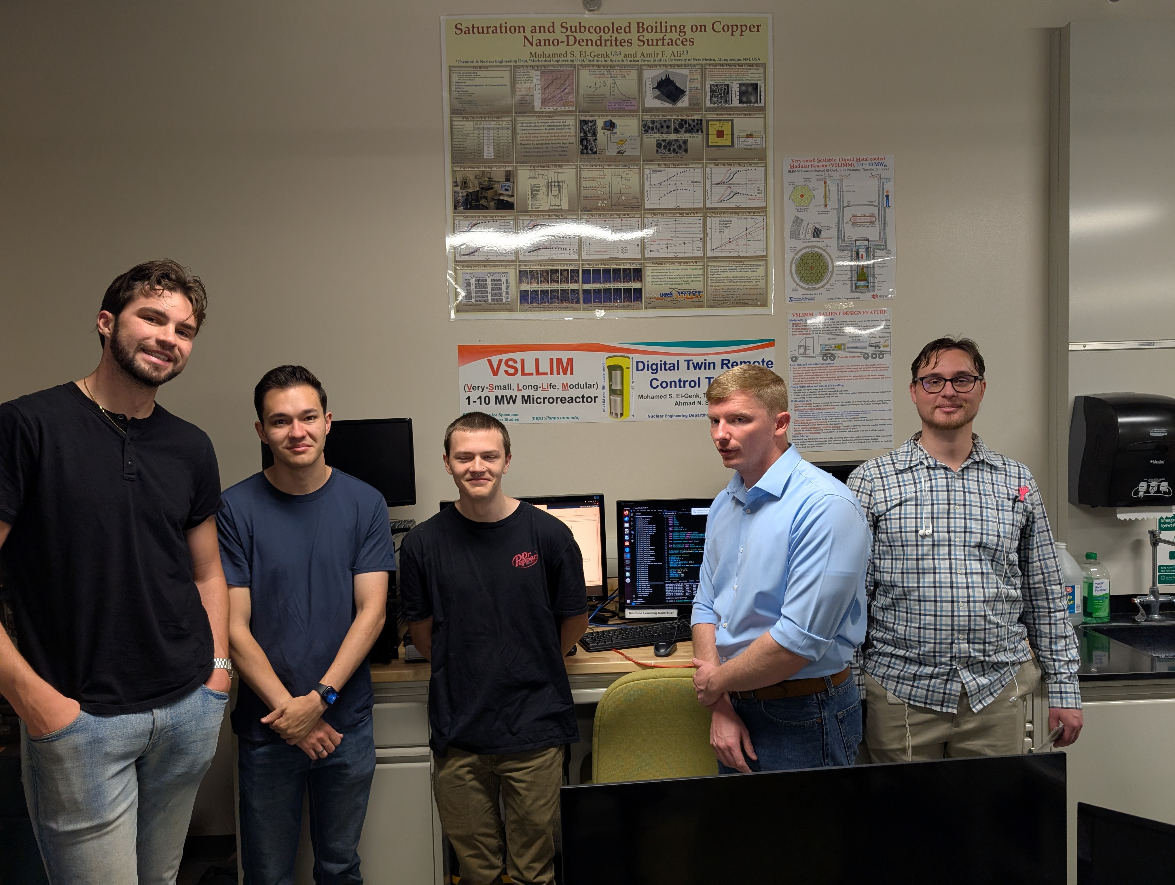 Nuclear Engineering seniors at the University of New Mexico visited the ISNPS Thermal-Hydraulics Lab B136 in the basement of Centennial Engineering building to learn about Modular Microreactor research being done at ISNPS. They viewed and inspected the 1:5 scale model of the developed invention of the fully passive, walk away safe, fast spectrum, sodium cooled VSLLIM (Very Small Long-Life Micro) reactor. It can be deployed with the entire power plant on an 18-wheeler truck, a railcar, or a barge. The plant would generate both heat and electricity for remote communities, military bases in desert and cold areas, and remote mining operations. The VSLLIM plant employs open air Brayton Cycle Engines to convert the reactor heat to electricity at an efficiency > 40%. It operates fully passive, requires no water cooling and can generate 1.0 to 10 MW of thermal power continuously for > 90 yr and > 6 yr, respectively. VSLLIM modular micro reactor design and associated IP disclosures have been licensed by the UNM Rainforest Innovation to Eagle Energy ( https://https://eagleenergymetals.com/ ) for commercial development, deployment, and marketing.